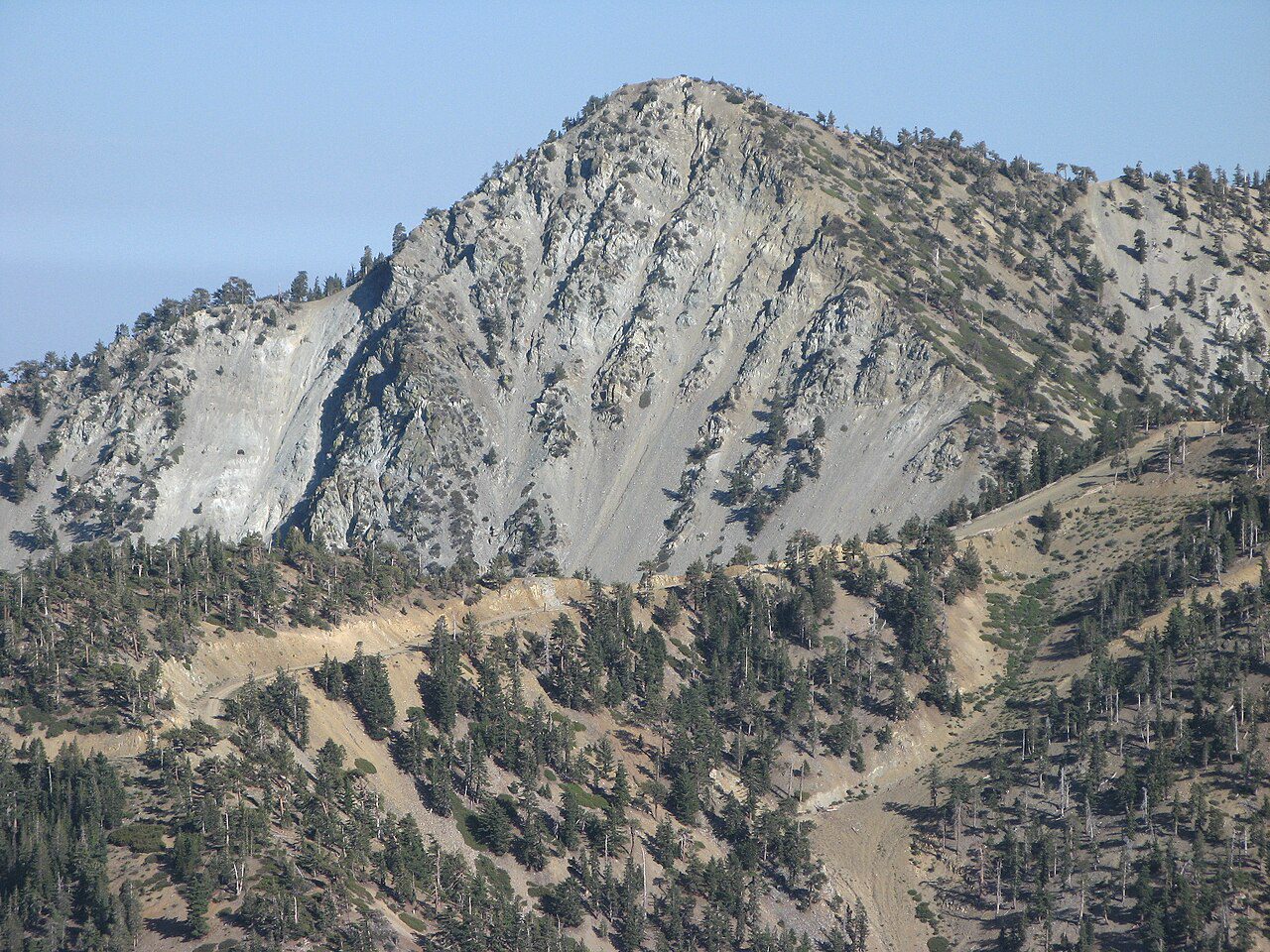 Mount San Antonio is the highest summit of the range, also known as Mount Baldy or Old Baldy. This peak, with an elevation of 10,064 feet (3,068 m), sits on the border of Los Angeles and San Bernardino Counties in California. The peaks of Mount San Antonio are often snow-capped, making them easily visible from a distance. They dominate the horizon of the Los Angeles Basin.